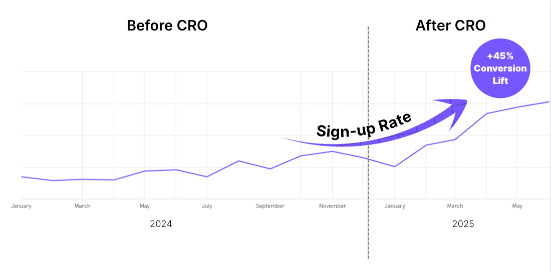 Most growth-stage SaaS teams want CRO but hit walls: no time, no expertise, or no budget for $20k retainer agencies.This SaaS was in the same spot until we ran focused, high-leverage experiments that delivered a 45% signup rate lift, 2x conversions, and $83,700 in revenue.Install your SaaS experimentation system in 21 Days.